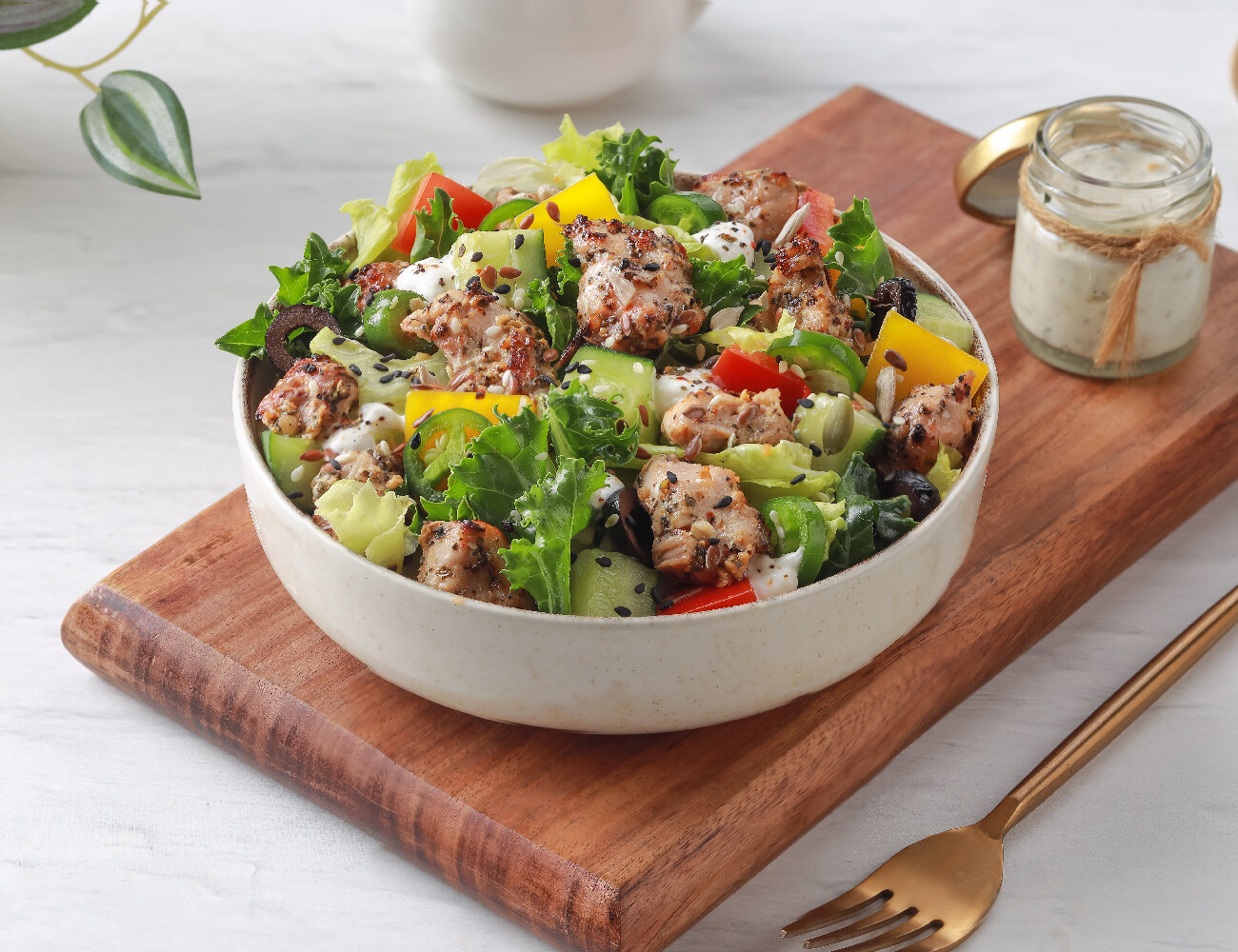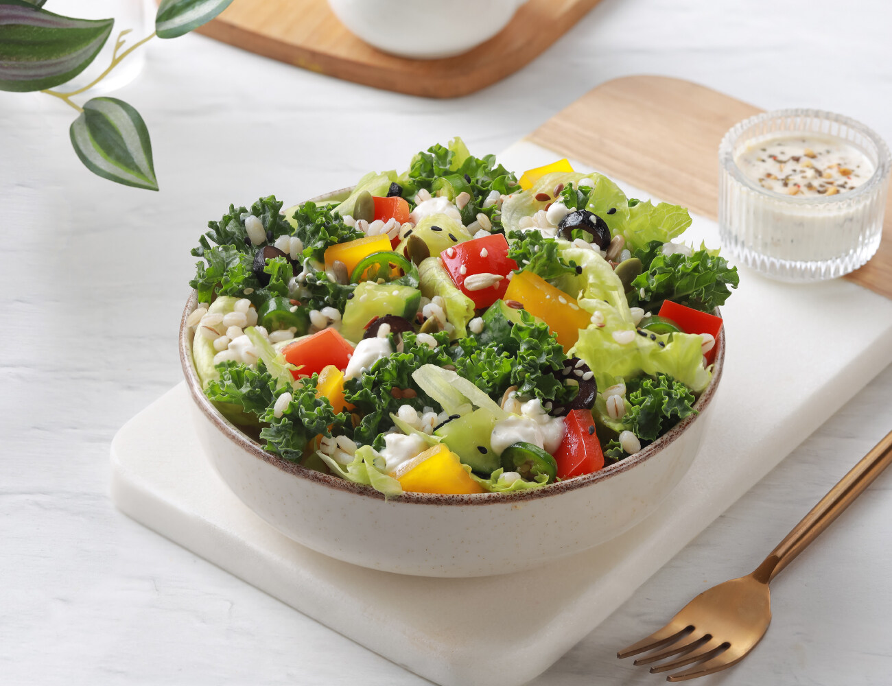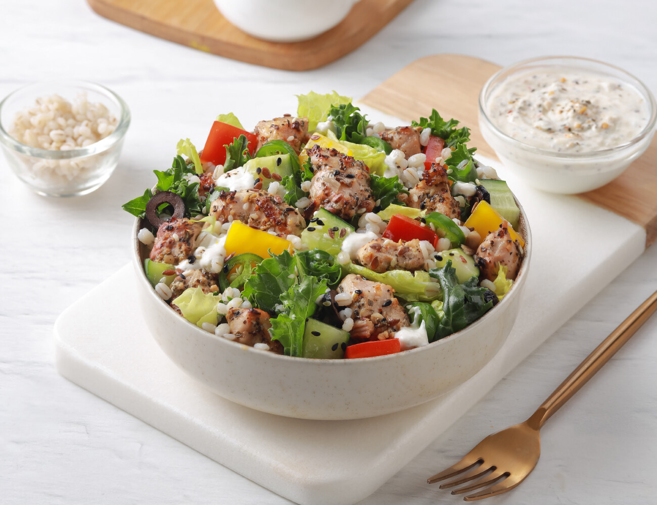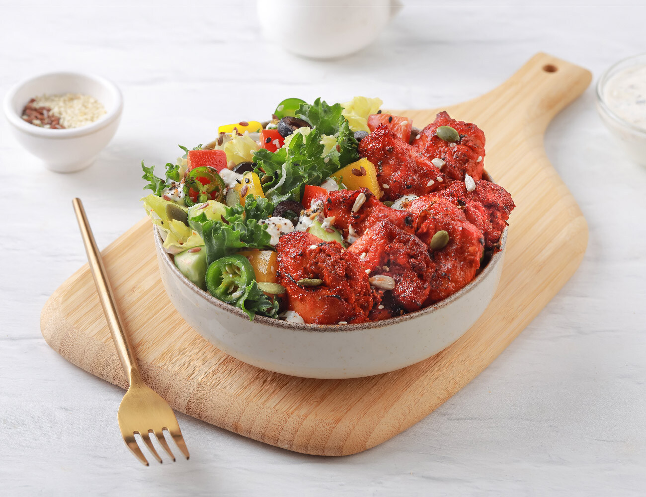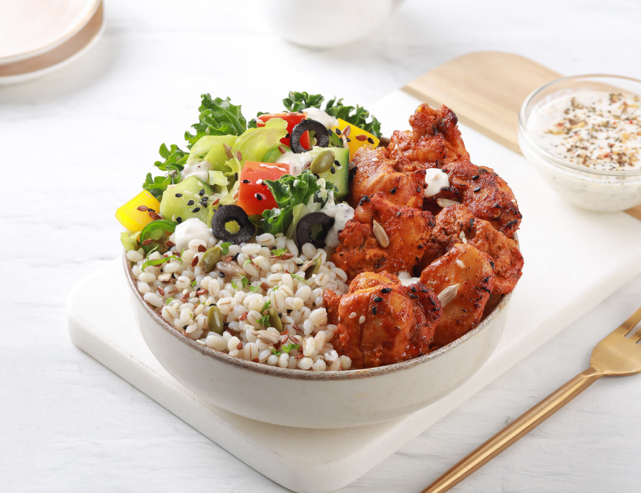 Peri Peri Paneer 100g | Dressing: Garlic Yogurt | Barley | Lettuce, Kale & Red Cabbage | Bell Peppers, Olive, Jalapeno, Cucumber | Super Seed Mix. [High Protein, Grilled, Fiber Rich] 716 Kcal | Protein: 32g | Carbs: 39g | Fat: 49g | Fiber: 8g